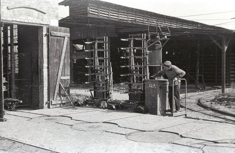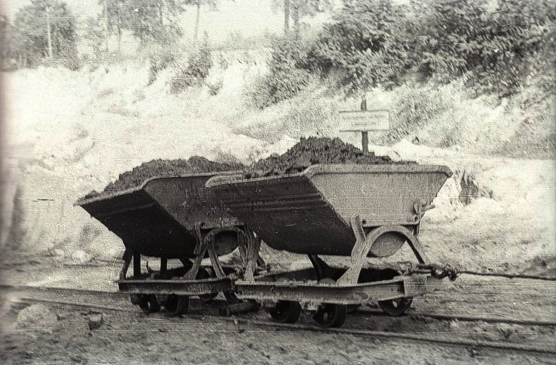 mit Ton beladenen Loren in der Grube wurden mittels Seilwinde