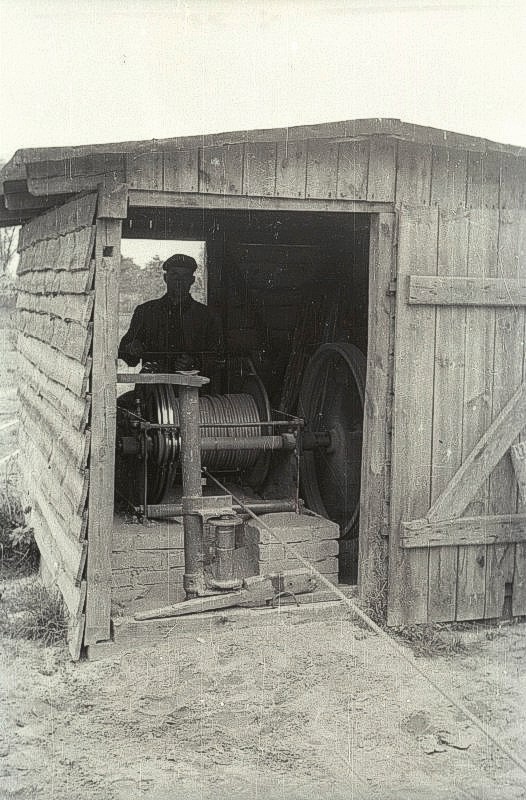 mit Ton beladenen Loren in der Grube wurden mittels Seilwinde